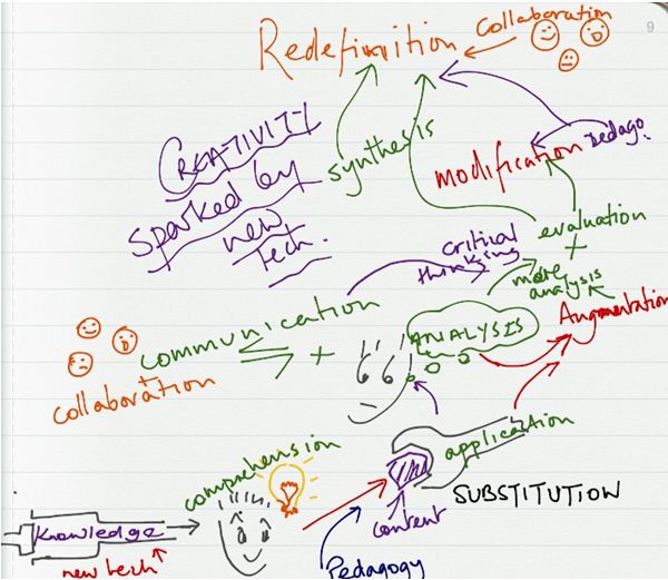 First comes an injection of knowledge of some new digital technique or device. Comprehension leads me to use my pedagogical knowledge, and apply the technique to help teach some content for which I think it may be appropriate. I’ve invoked TPACK concepts (see below), but I’ll also concede that at this stage I am probably only substituting a digital technique for a previous method (SAMR, notes on this below too). Reflection and analysis, with some communication and collaboration (from students or colleagues) will hopefully lead to Augmentation, so that the results of using the new tool are better than those with previous teaching methods. More collaboration and communication, combined with critical thinking and evaluation should lead to Modification of the original task. Leading to the peak of Bloom’s taxonomy where all the previous inputs are synthesised and in a burst of creativity the original task is redefined and re-imagined to produce results that were impossible to achieve previously.