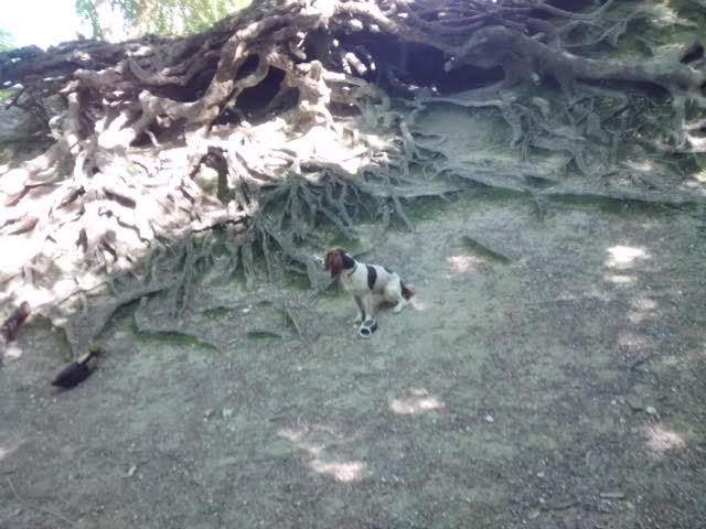 We walked back down through the woods, the dog drying slowly, and paused to visit a favourite tree. The tree grows on a bank that has washed away, so that its roots are exposed. It resembles Yggdrasil, I expected to see the Norns weaving our fates but there are only the ashes of a campfire.